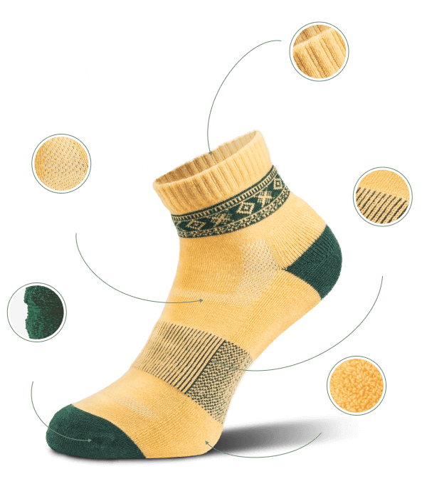 Terry loops provide cushioning, create air pockets for insulation, and wick away moisture. We've placed them in high-stress areas to add extra comfort and support for your soles, ankles, and Achilles.