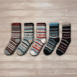 Let the flames warm your soul and the words your mind while the Bjorn sock set does the same for your feet. Subdued nudes and browns are enhanced by pastel blue and white accents paired with a classic Nordic pattern of stripes, crosses, and checks.