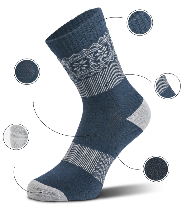 Each sock has a unique decorative band adorned with Nordic patterns circling the ankle.The cold shades of black blueberry and steely blue turn the print up a notch. They look great in boots, running shoes, and even dress shoes.